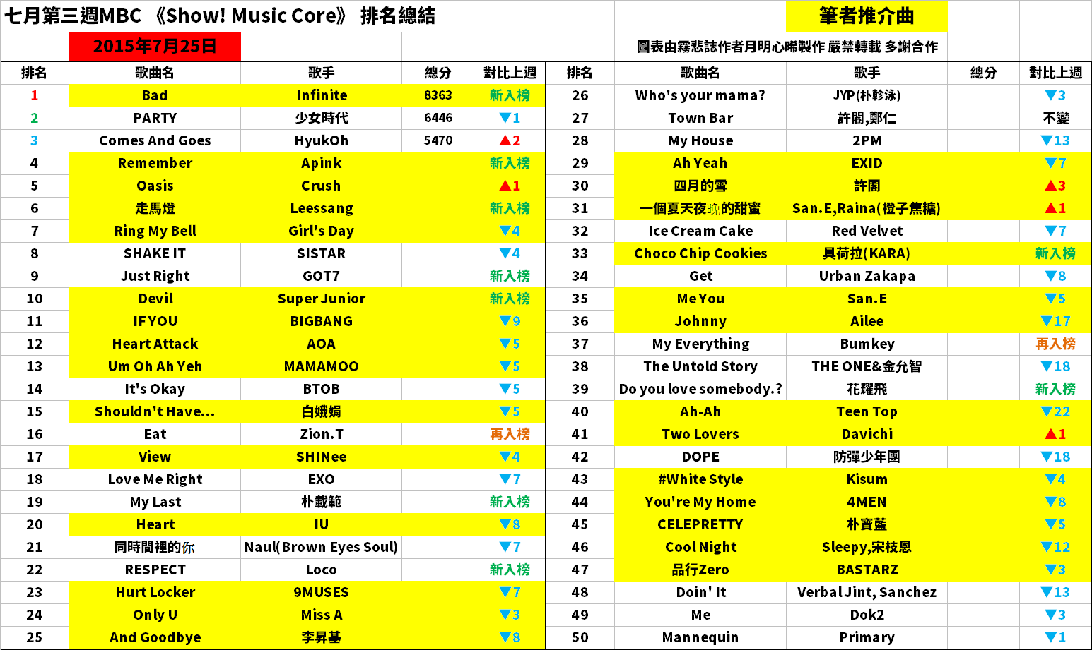 (本週MBC音樂中心榜單成績仍未公佈,只有於該日放送時出現的排名。待官方公佈該榜單再作修正。)